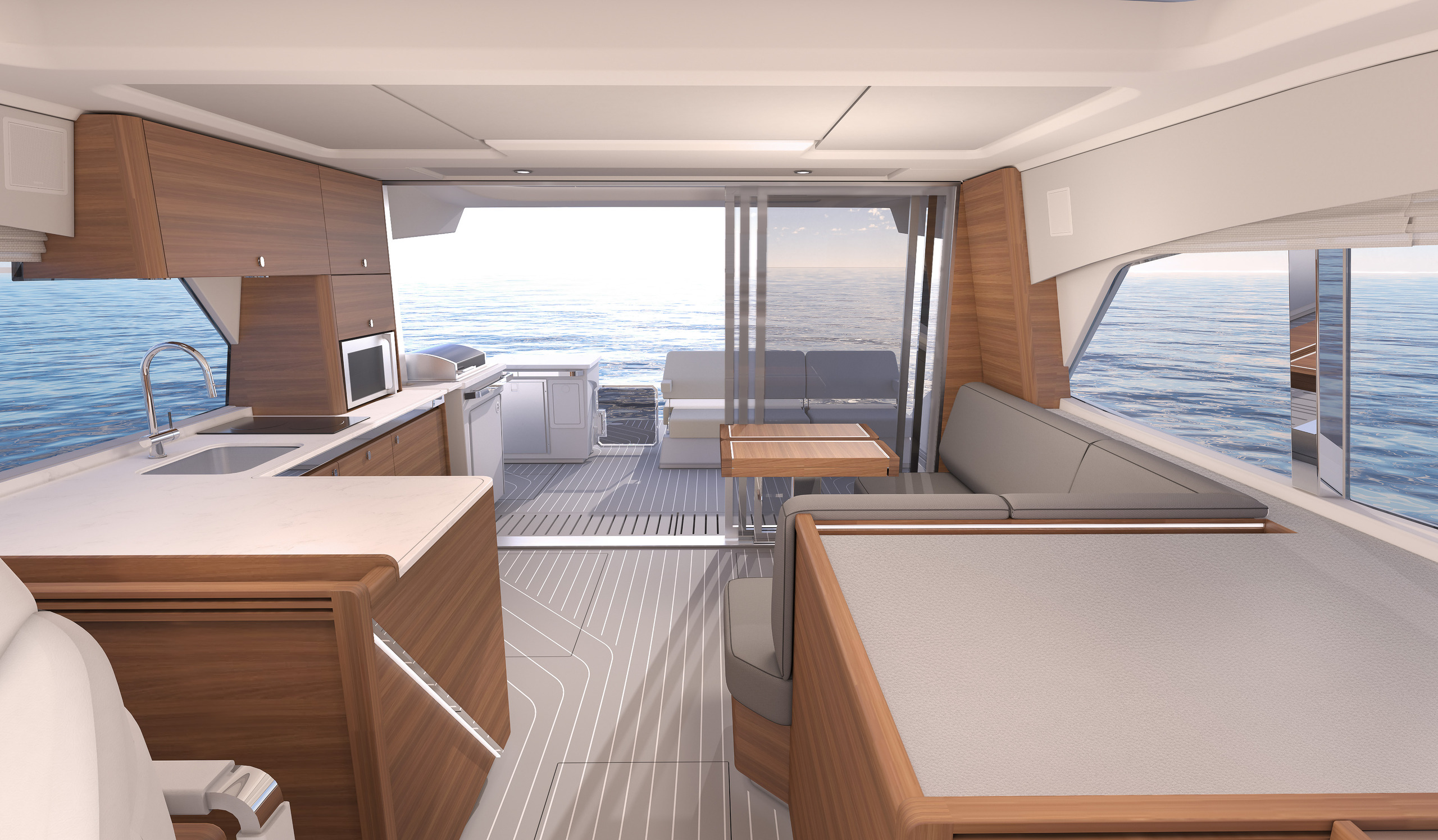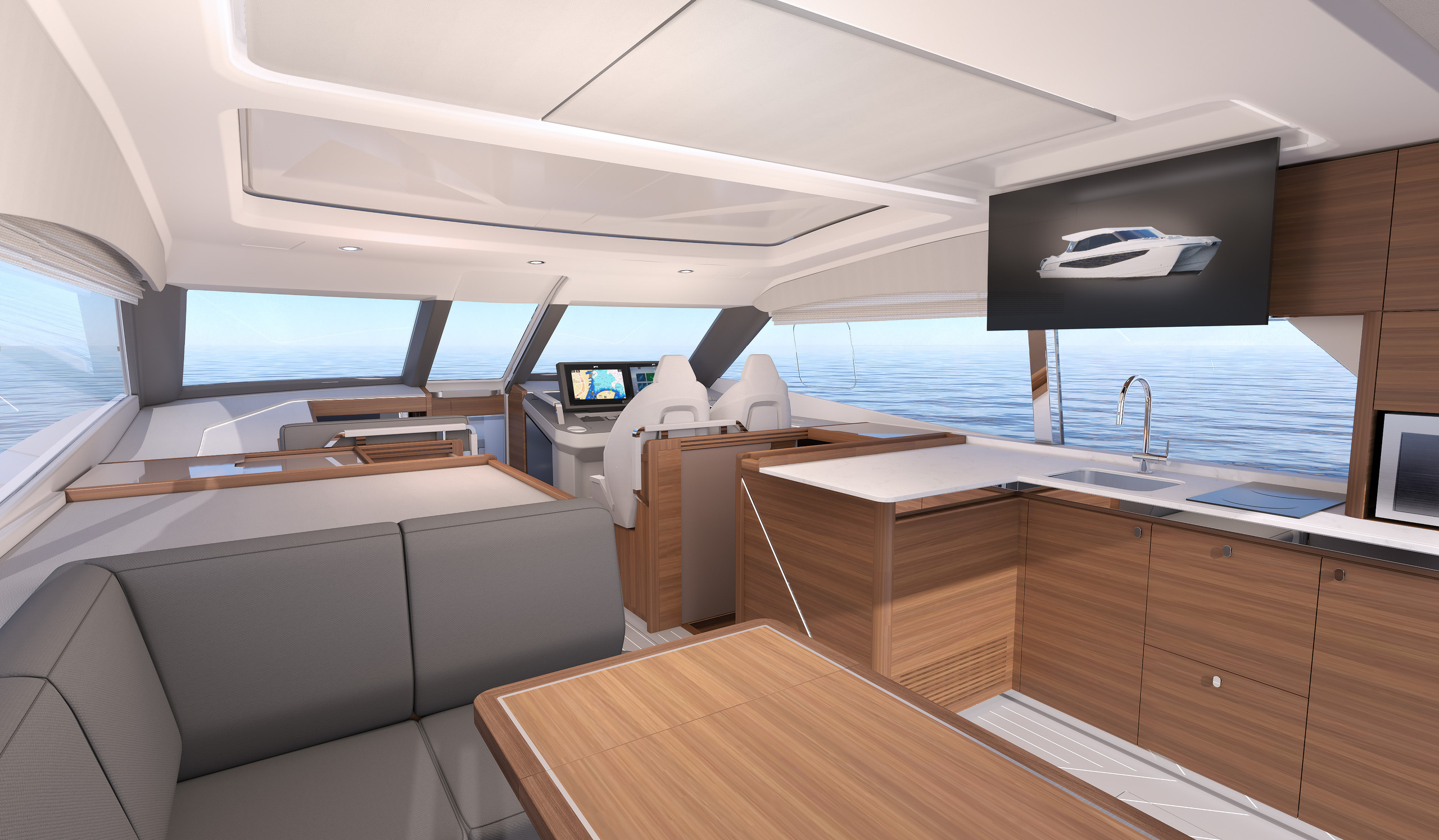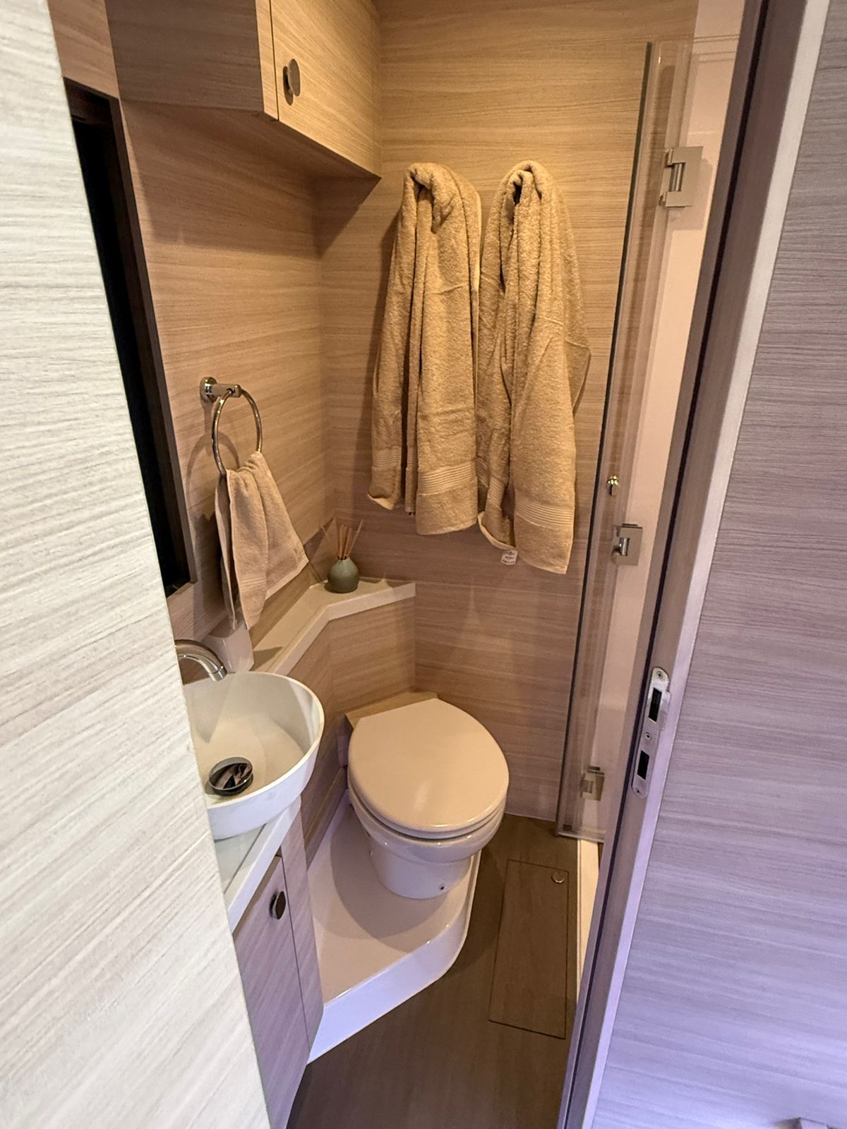 Step aboard and you’ll immediately appreciate how this boat refuses to compromise. Its generous beam creates remarkable space for entertaining, while the single-level layout flows intuitively from salon to cockpit. This fresh design captures all the excitement of a sport boat with double stepped hulls while delivering premium features—two private cabins with en-suite bathrooms and separate showers.