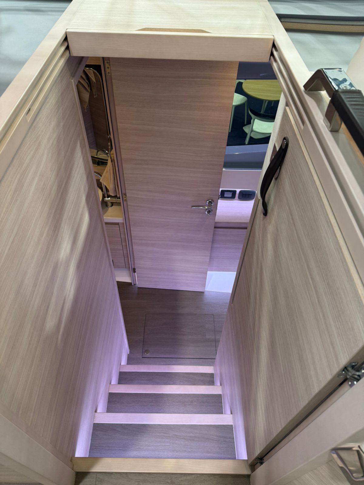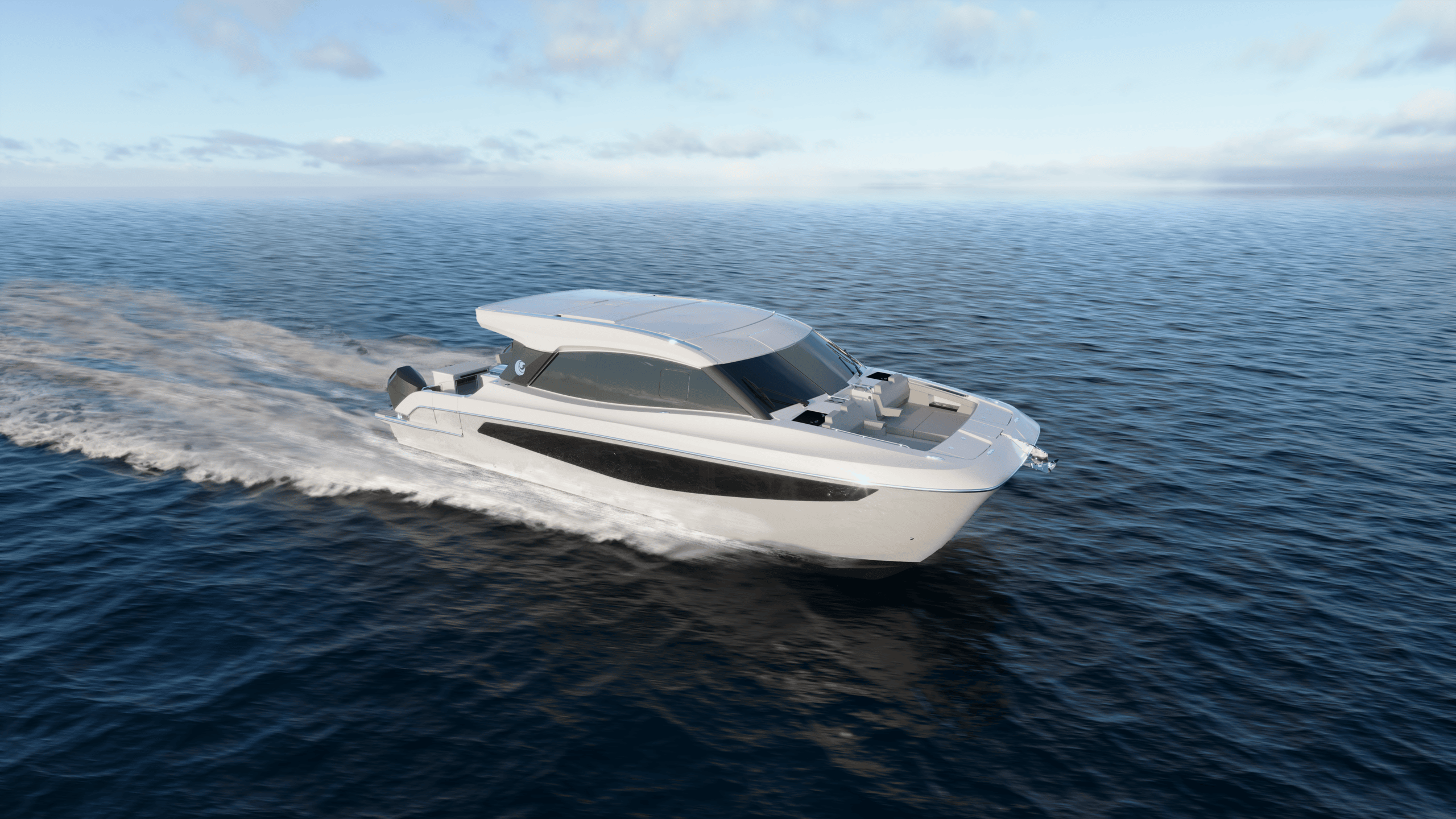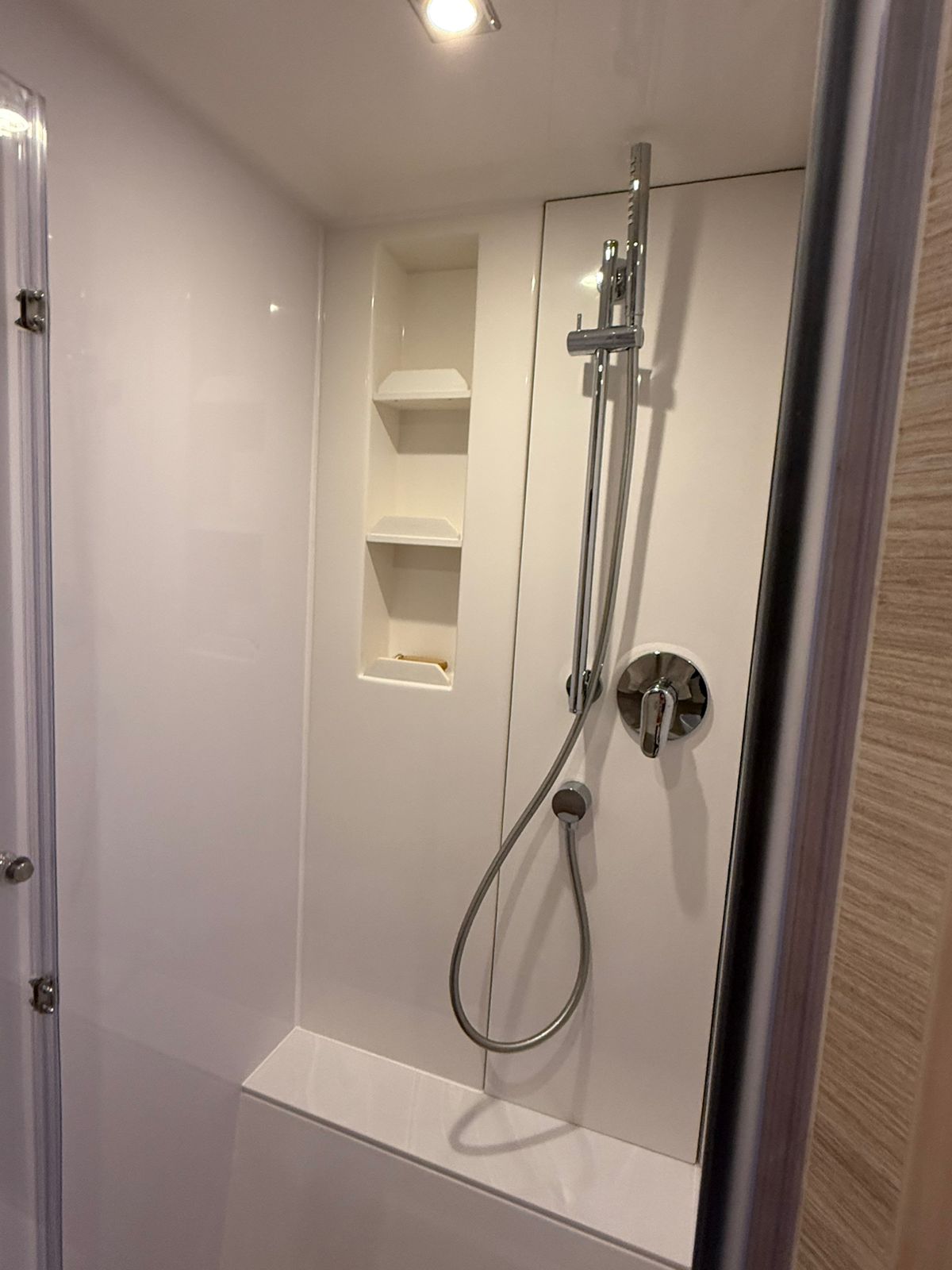 Step aboard and you’ll immediately appreciate how this boat refuses to compromise. Its generous beam creates remarkable space for entertaining, while the single-level layout flows intuitively from salon to cockpit. This fresh design captures all the excitement of a sport boat with double stepped hulls while delivering premium features—two private cabins with en-suite bathrooms and separate showers.